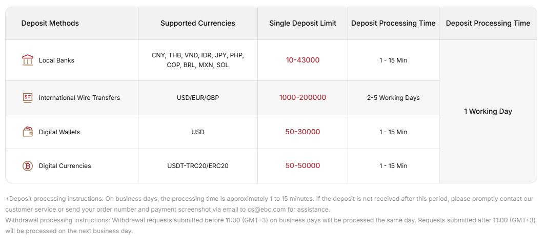 EBC Financial Group supports local bank transfers, international wire transfers, electronic wallets, cryptocurrencies, etc.